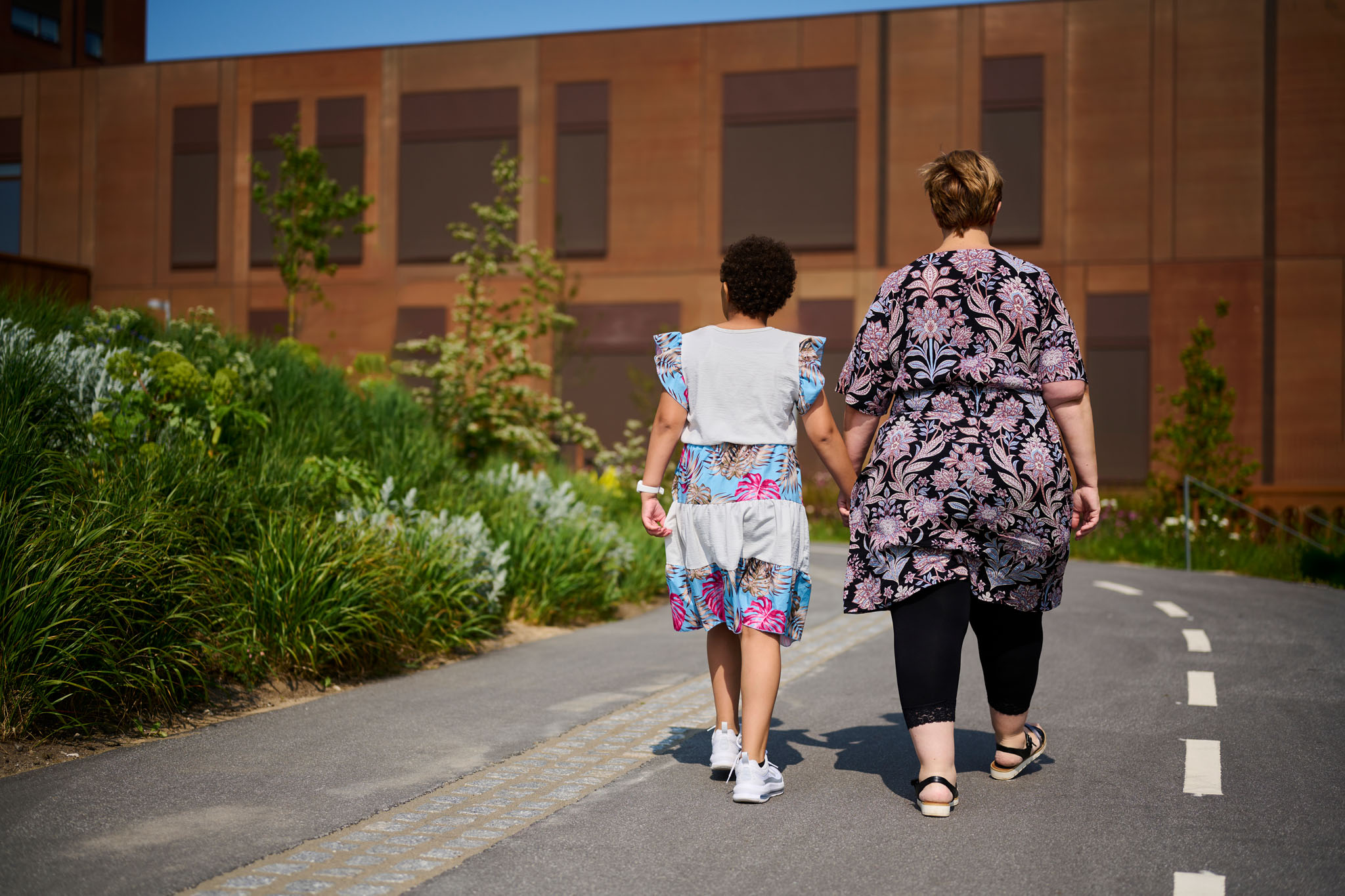 Mor og datter går en tur udenfor.