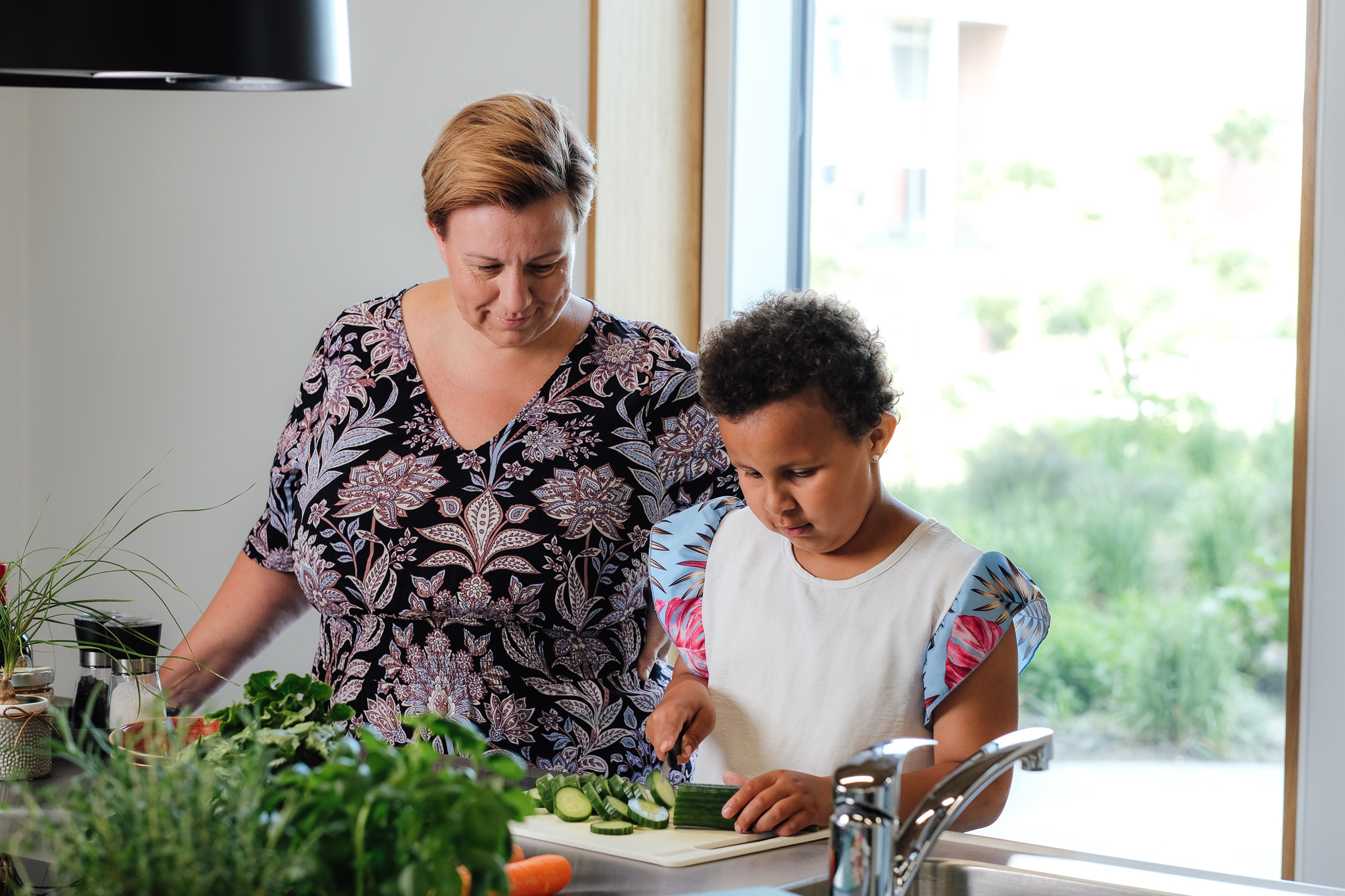 Mor og datter laver mad sammen.