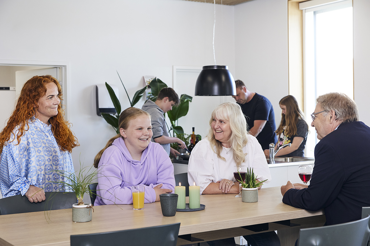 string(94) "Familie med far, mor, børn og bedsteforældre sidder ved et bord eller laver mad i køkkenet."