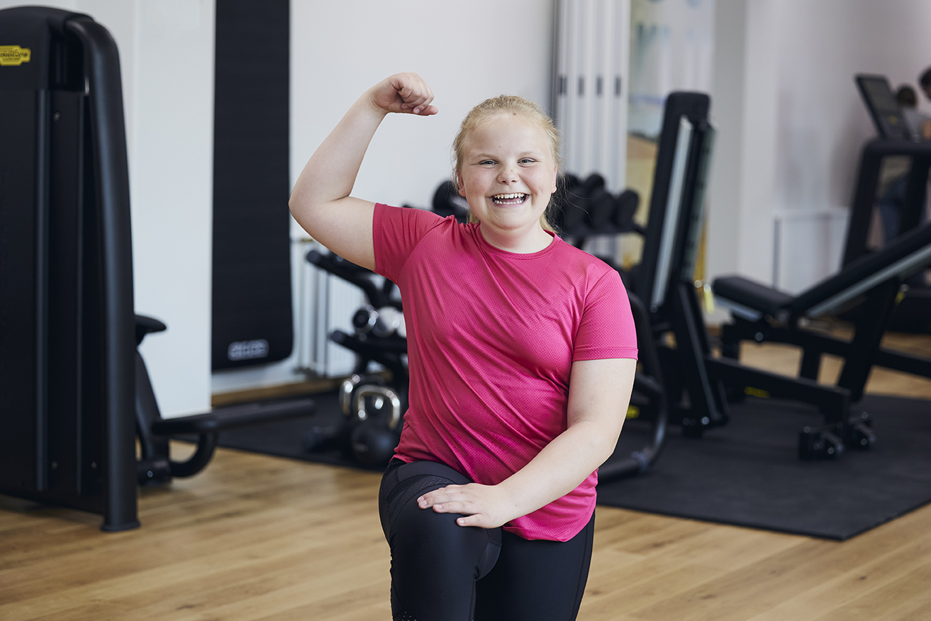 Pige viser glad sin overarm frem i et træningscenter.